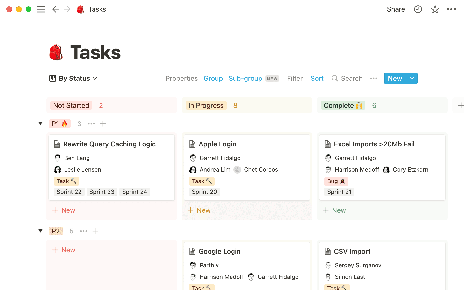 If your board was already grouped by a Status property (e.g. "Not started," "In progress," "Complete"), now you can create sub-groups of those tasks organized by Priority, Team, Assignee, or whatever property you need โ all while keeping your Status columns intact.Group by more properties, including Relation, Number, Date and more
